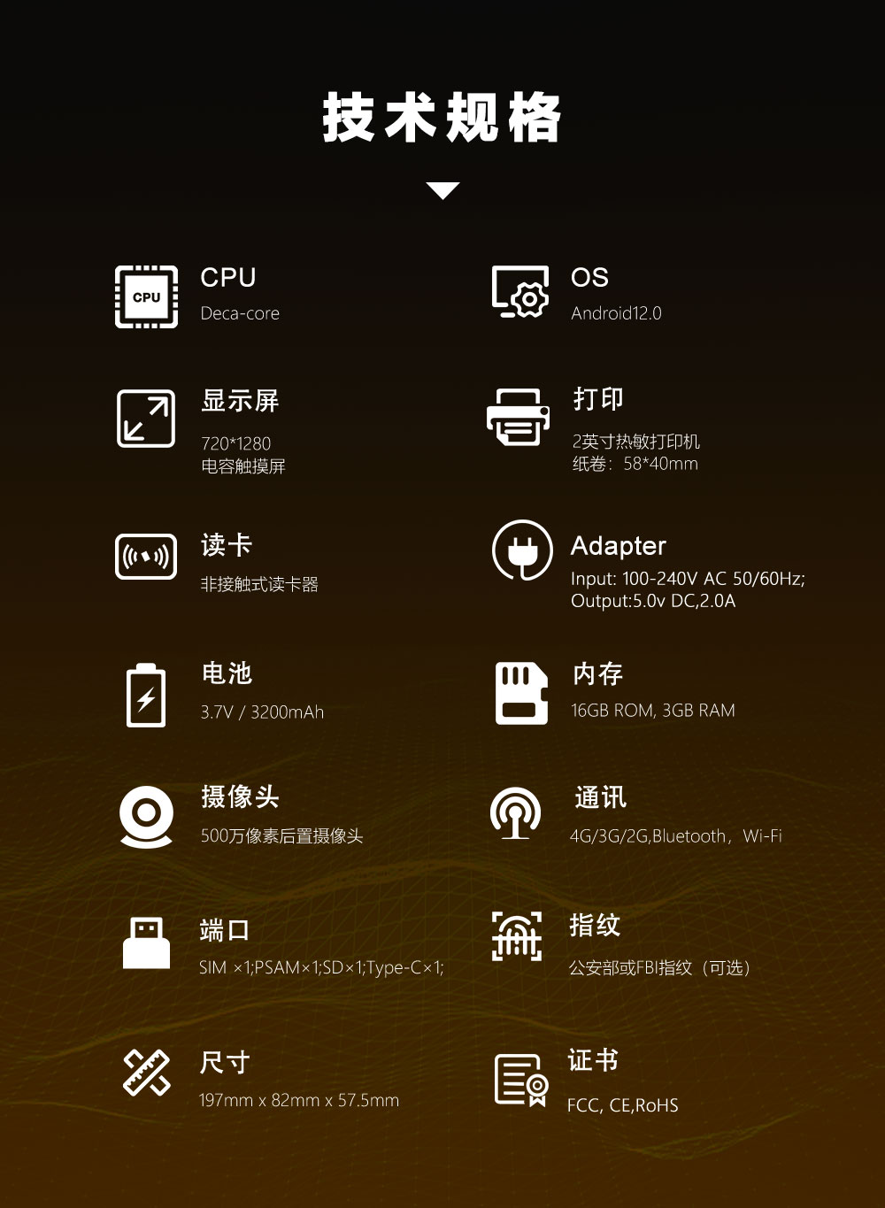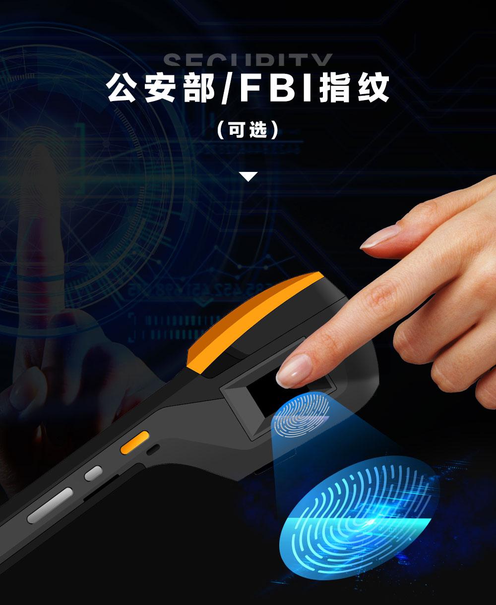 FBI指纹(选配)、NFC、IC卡读卡器、摄像头、红外扫描头(选配) |